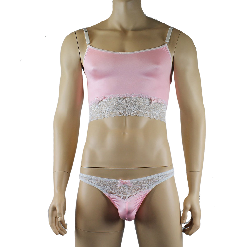 Mens Joanne Satin & Lace Crop Cami Top with Sexy Thong - Sizes up to 3XL Light Pink and White Lace