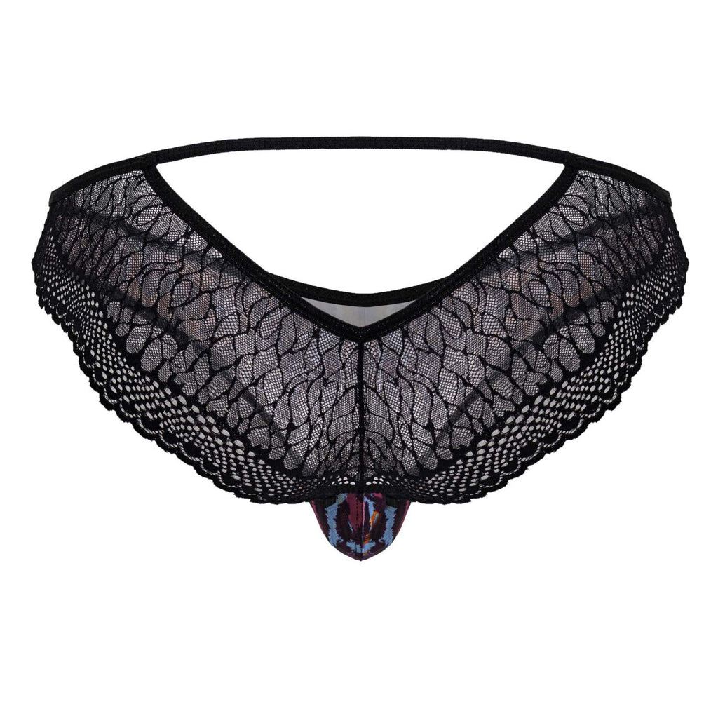 Show off your wild side with this daring men's thong. The front features a vibrant multi-color animal print that commands attention, while the back is finished with soft black lace and a cheeky cutout for a bold, seductive look. Lightweight and stretchy, it provides a body-hugging fit that's as comfortable as it is eye-catching.