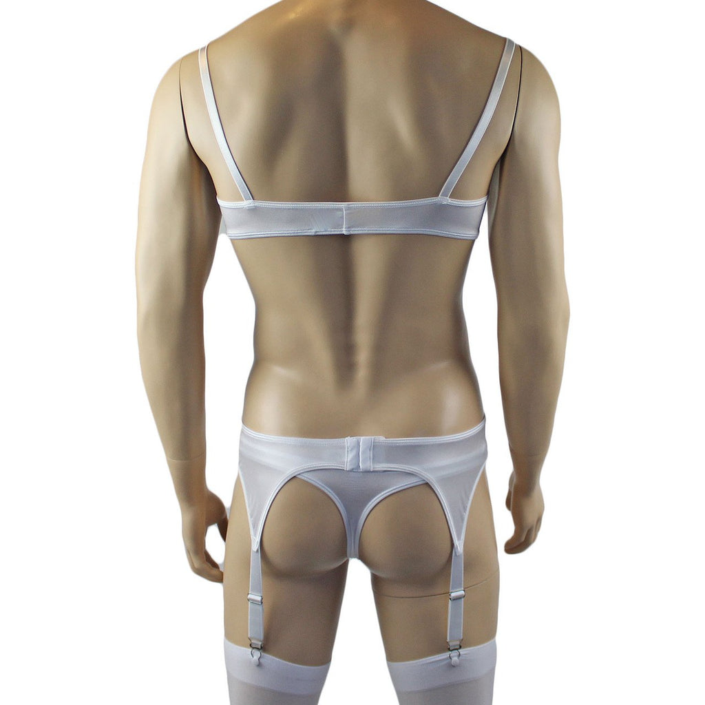 Male Romance Stretch Spandex Bra, G string Thong & Garterbelt White