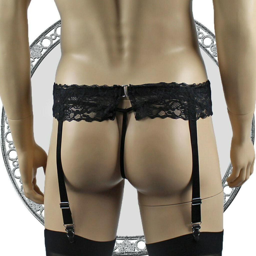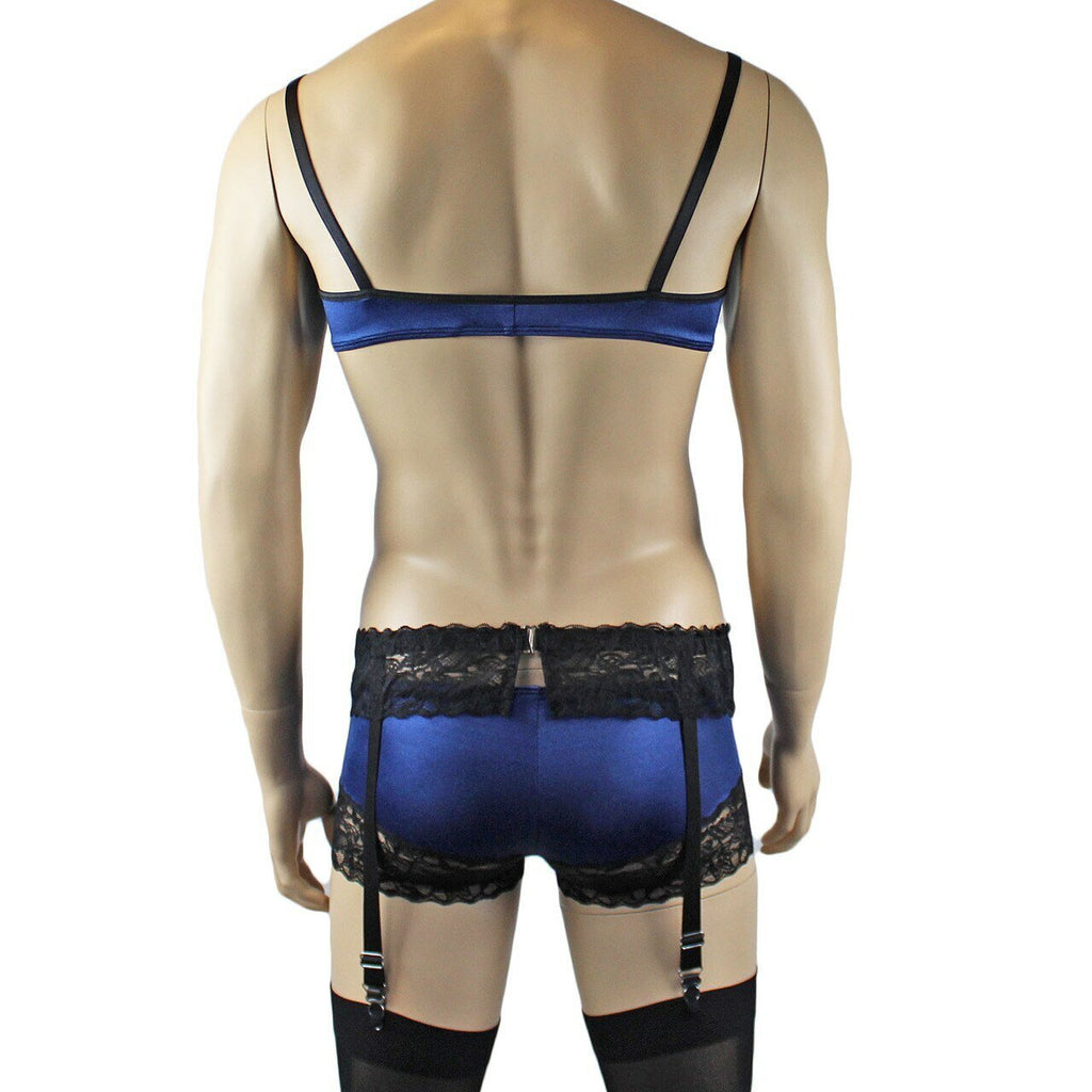 Mens Glamour Spandex & Lace Bra Top, Boxer Brief Shorts with Garterbelt & Stockings Navy and Black