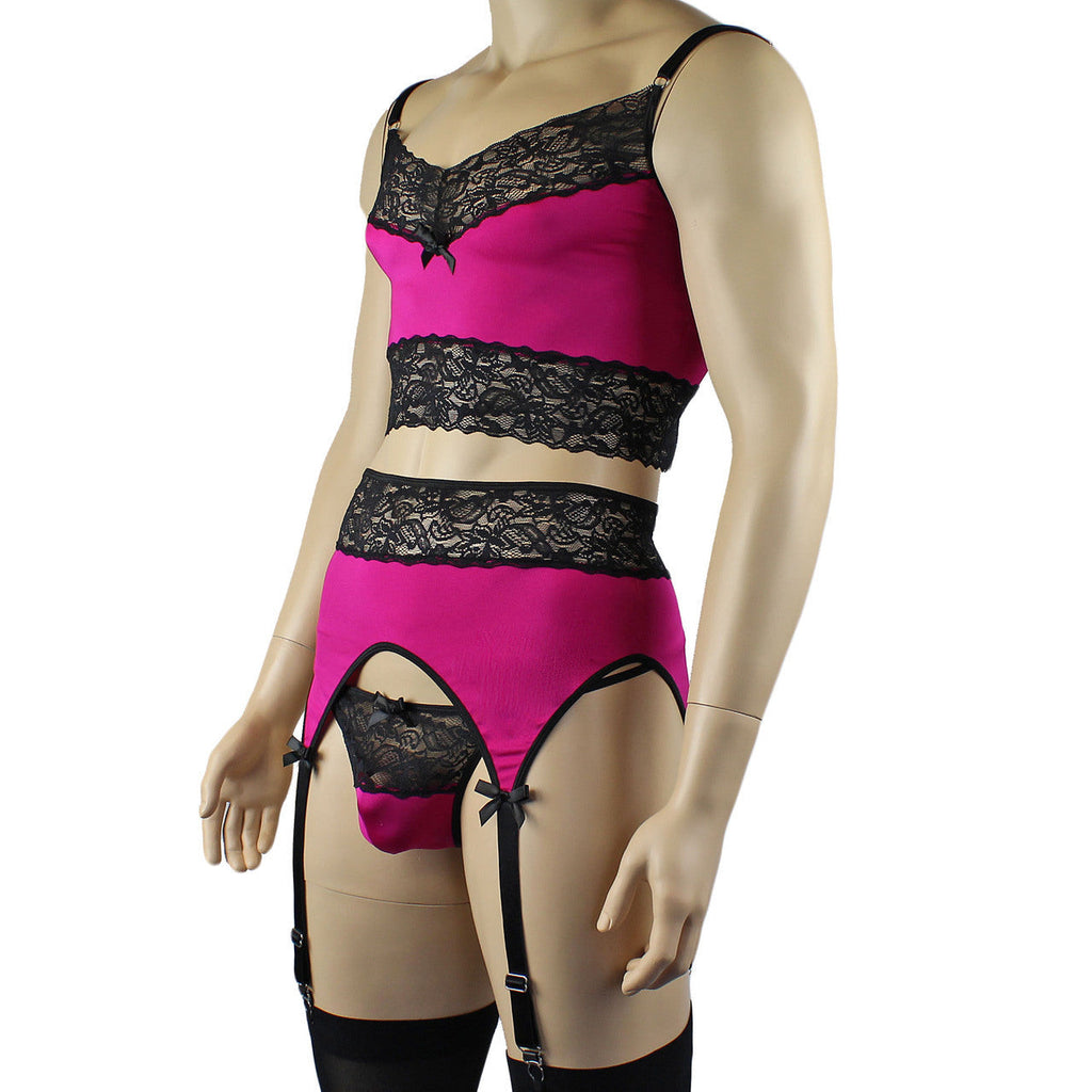 Mens Glamour Cami Top, Garterbelt, G string & Stockings - Sizes up to 3XL Raspberry and Black