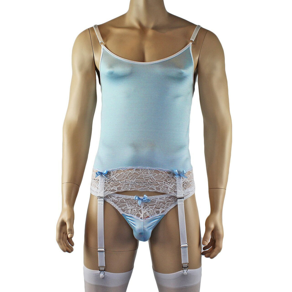 Mens Joanne Camisole Bustier Garter Top with Thong & Stockings - Sizes up to 3XL Light Blue and White Lace